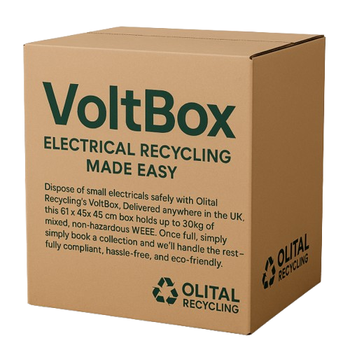 VoltBox – Electrical Recycling Made Easy Dispose of small electricals safely with Olital Recycling’s VoltBox. Delivered anywhere in the UK, this 61×45×45cm box holds up to 30kg of mixed, non-hazardous WEEE. Once full, simply book a collection and we’ll handle the rest – fully compliant, hassle-free, and eco-friendly.